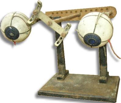 Ophthalmotrope. An excellent device for making clear the action of the extrinsic muscles of the eye. The cords of different colors, representing the muscles, run over pulleys and are kept taut by weights. The eye models are mounted on ball-and-socket joints and so are easily adjustable. The right eye is furnished with a rod, at the end of which is attached a disk indicating the field of view. A special upright with a pulley and counterpoise permits easy adjustment of the disk representing the field of view.  |